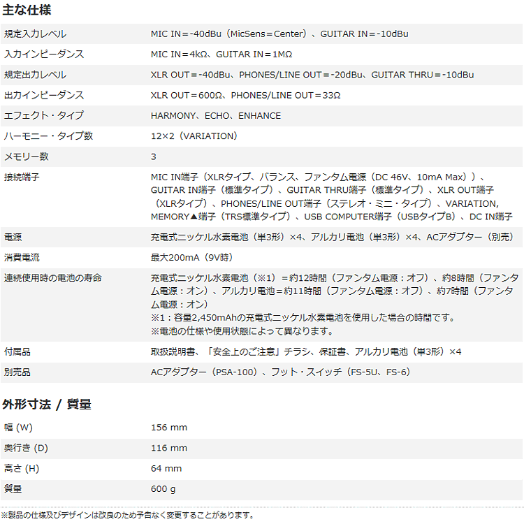 主な仕様 規定入力レベル MIC IN=-40dBu(MicSens=Center)、GUITAR IN=-10dBu 入力インピーダンス MIC IN=4kΩ、GUITAR IN=1MΩ 規定出力レベル XLR OUT=-40dBu、PHONES/LINE OUT=-20dBu、GUITAR THRU=-10dBu エフェクト・タイプ HARMONY、ECHO、ENHANCE ハーモニー・タイプ数 12×2(VARIATION) メモリー数 3 接続端子 MIC IN端子(XLRタイプ、バランス、ファンタム電源(DC 46V、10mA Max))、GUITAR IN端子(標準タイプ)、GUITAR THRU端子(標準タイプ)、XLR OUT端子(XLRタイプ)、PHONES/LINE OUT端子(ステレオ・ミニ・タイプ)、VARIATION, MEMORY▲端子(TRS標準タイプ)、USB COMPUTER端子(USBタイプB)、DC IN端子 電源 充電式ニッケル水素電池(単3形)×4、アルカリ電池(単3形)×4、ACアダプター(別売) 付属品 取扱説明書、「安全上のご注意」チラシ、保証書、アルカリ電池(単3形)×4 外形寸法 / 質量 幅 (W):156 mm 奥行き (D):116 mm 高さ (H):64 mm 質量:600 g ご確認ください。